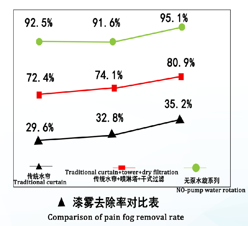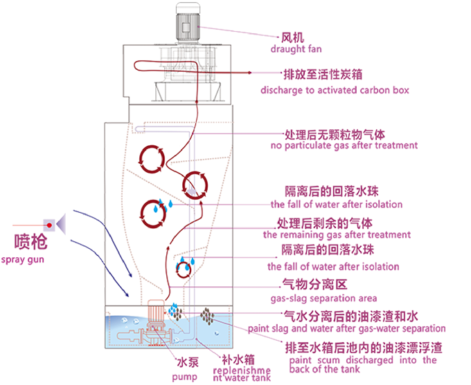 含有漆霧、漆渣、油雰、粉塵的有機廢氣被排風機高速吸入設備,通過渦旋室的離心カ, 進入旋流洗條室, 使廢氣的濃度和粘度降低,經處理的廢氣再進入氣液分離室。再離心力的作用下,漆雰、漆渣、油雰、粉塵等顆粒物從混合廢氣中分離出來,碰到水膜上被收集。分離出的有機廢氣(通過離心力甩干后,已經和正常空氣的濕度一樣 )進入到后端的廢氣處理系統,分離出的水則被擋水板阻隔,通過排渣口返回到水箱,廢渣回落到回水槽被收集至后部回水撈渣池中。在高速返回沖去力的作用下 ,漆雰形成類似泡沫狀的漆渣漂浮在回水撈渣池水面上,通過定期清除漆渣達到凈化水從而使水達到持續循環利用的目的。